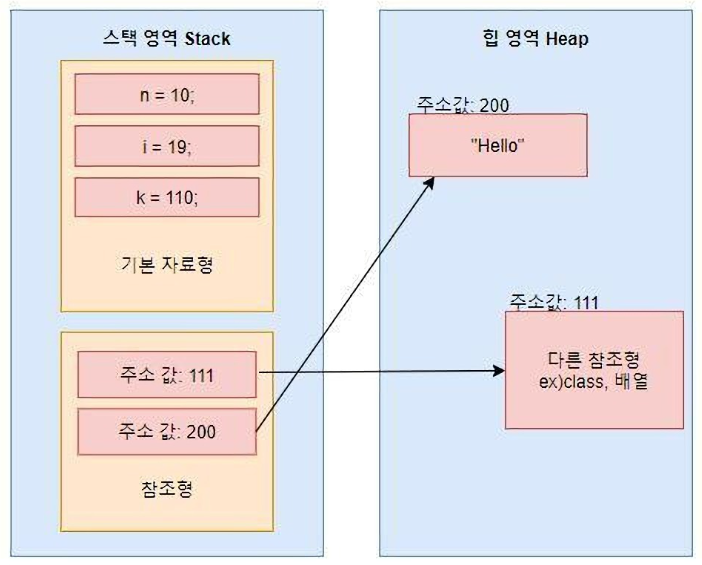 - ๋ฉ๋ชจ๋ฆฌ์ ํ(Heap)์ ์ค์ ๊ฐ์ ์ ์ฅํ๊ณ , ๊ทธ ์ฐธ์กฐ๊ฐ(์ฃผ์๊ฐ)์ ๊ฐ๋ ๋ณ์๋ ์คํ(Stack)์ ์ ์ฅ