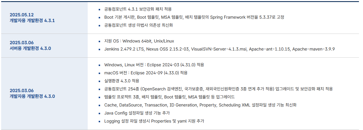 ์ ์์ ๋ถํ๋ ์์ํฌ๋? : ๊ณต๊ณต์ ๋ณดํ ์ฌ์ ์์ ์ํํธ์จ์ด ๊ฐ๋ฐ ์์ฐ์ฑ๊ณผ ํ์ง์ ๋์ด๊ธฐ ์ํด ํ์คํ๋ ๊ฐ๋ฐ ํ๊ฒฝ๊ณผ ๊ณตํต ์ปดํฌ๋ํธ๋ฅผ ์ ๊ณตํ๋ JAVA ๊ธฐ๋ฐ์ ์คํ์์ค ํ์ค ํ๋ ์์ํฌ์ด๋ค.https://www.egovframe.go.kr/home/main.do ํ์คํ๋ ์์ํฌ ํฌํธ eGovFrame๋ณธ๋ฌธ ๋ด์ฉ ๋ฐ๋ก๊ฐ๊ธฐ ๋๋ฉ๋ด ๋ฐ๋ก๊ฐ๊ธฐ ์๊ฐ ๊ตฌ์ฑ ๊ตฌ์ฑ์์ธ ๋ฒ์ ๋ณ ๊ตฌ์ฑ ์คํ์์ค SW ํํฉ ์ํคํ ์ณ ๋ผ์ด์ ์ค ์ ์ฉ์ฌ๋ก ์ถ์ง์ฑ๊ณผ ๊ธฐ์ ์ง์๋ด์ญ ์ปจํธ๋ฆฌ๋ทฐ์ ์ผํฐ์๊ฐ ์ง์์๋น์ค ์ ์ฉ์ง์ ์๋น์คwww.egovframe.go.kr 1๏ธโฃ ๊ฐ๋ฐํ๊ฒฝ ๋ค์ด๋ก๋ (ver 4.3.1)๊ฐ๋ฐํ๋ ์์ํฌ ๊ฐ๋ฐํ๊ฒฝ ์ค์น ๊ฐ์ด๋ https://www.egovframe.go.kr/wiki/doku.php?id=egovframework:dev4.3:cln..